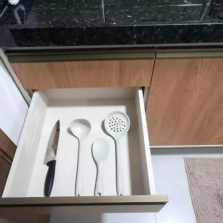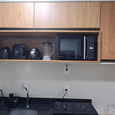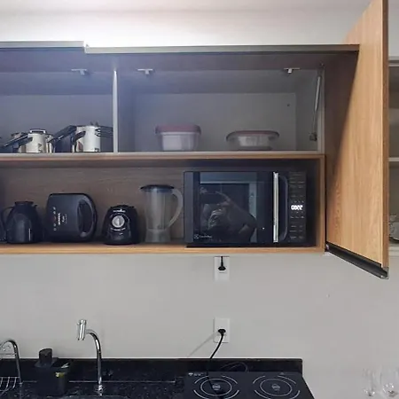 O apartamento tem varanda e cozinha totalmente equipada, e confortos como controle de temperatura.